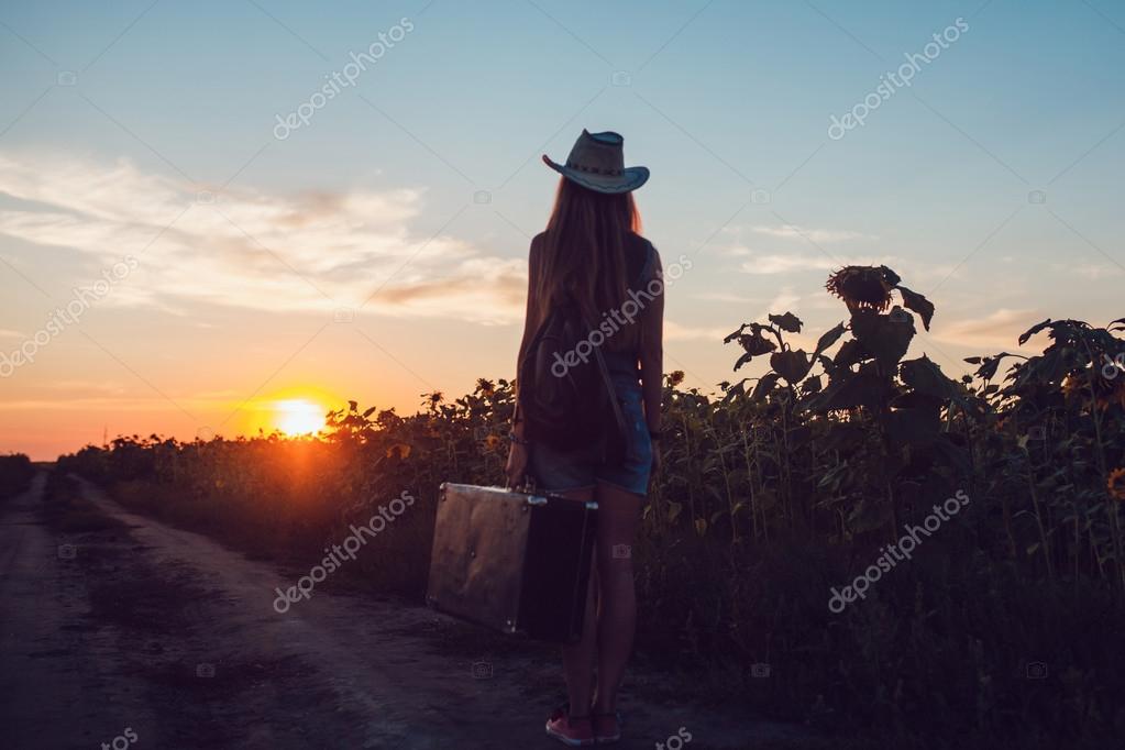 Menina Em Um Chapeu De Cowboy Que Esta Com Uma Mala Na Estrada No