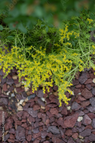 Gold Moss Sedum Sedum De Oro Is Blooming Over Lava Rock In The