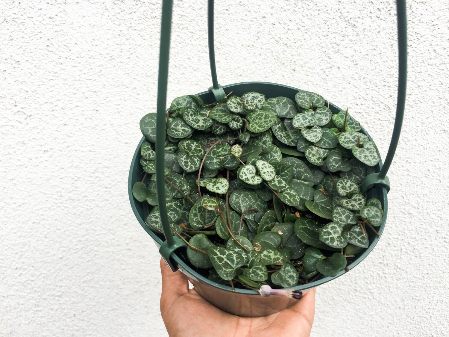 Perfect for hanging baskets rosary vine ceropegia linearis woodii is a trailing succulent with heart shaped silver and green leaves. This succulent tolerates prolonged drought and does well in a bright light position. It may produce greenish flowers when happy.