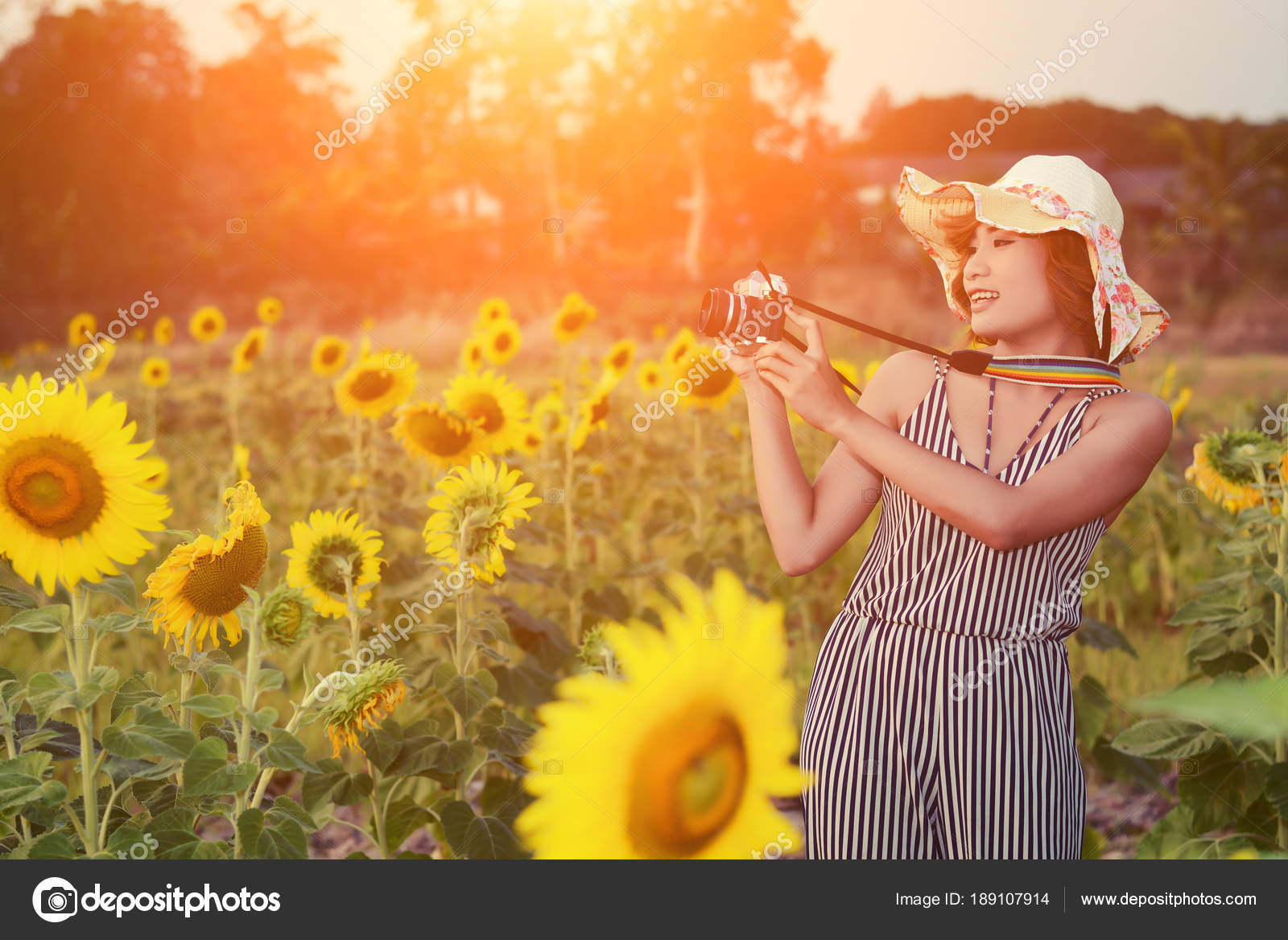 Bela Mulher Sexy Tirar Foto Da Camera Retro Em Girassol F Stock