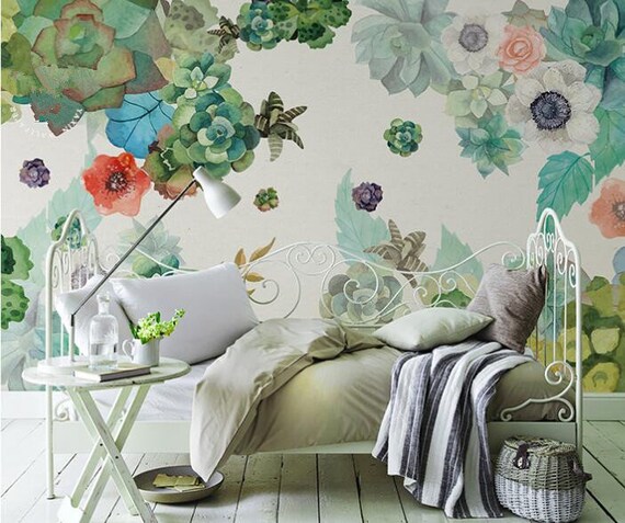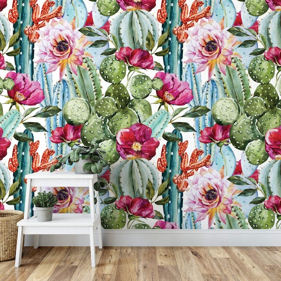 Watercolor Succulent Floral Removable Wallpaper Cactus Self Etsy