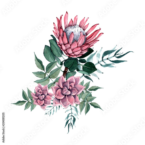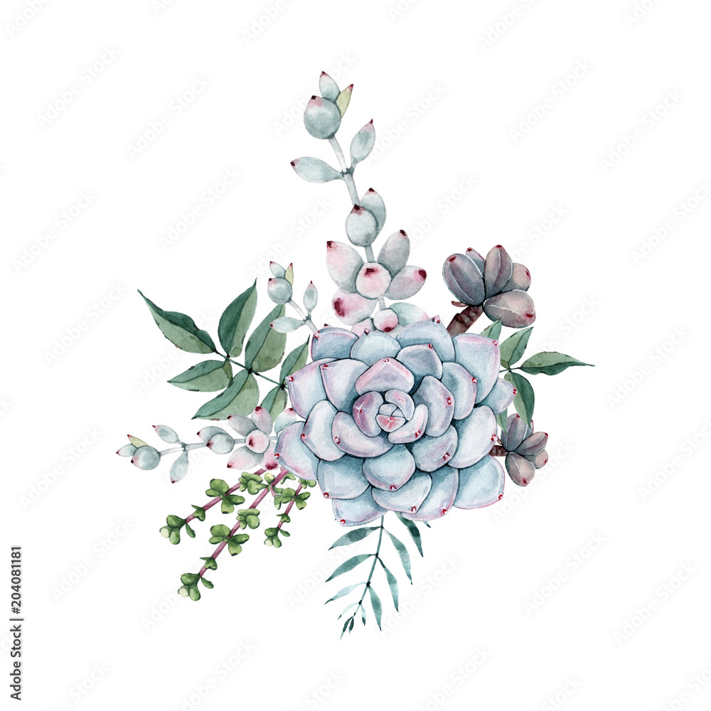 Watercolor Succulent Bouquet Isolated On White Background Stock