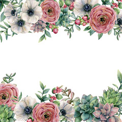 Watercolor Succulents And Anemone Flowers Seamless Pattern On