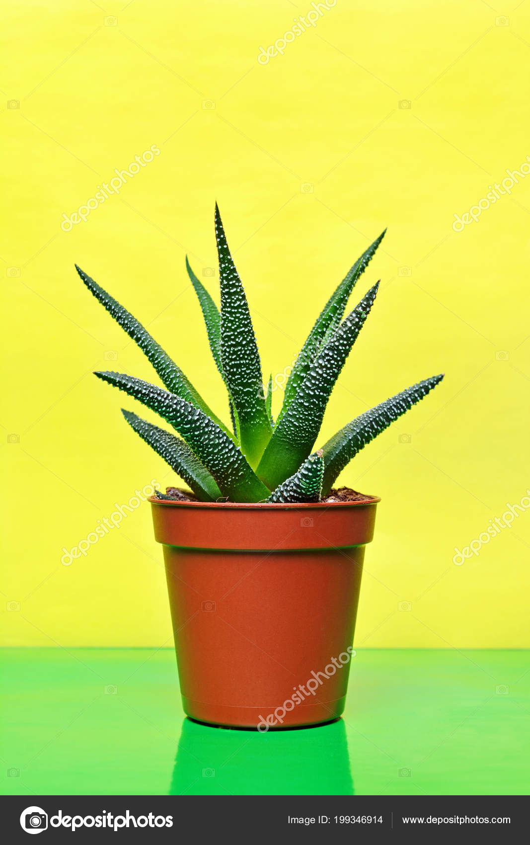 Small Green Succulent Red Flower Pot Bright Yellow Background