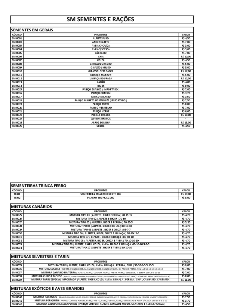 Tabela Precos Sm Janeiro 2018 Aves Papagaio