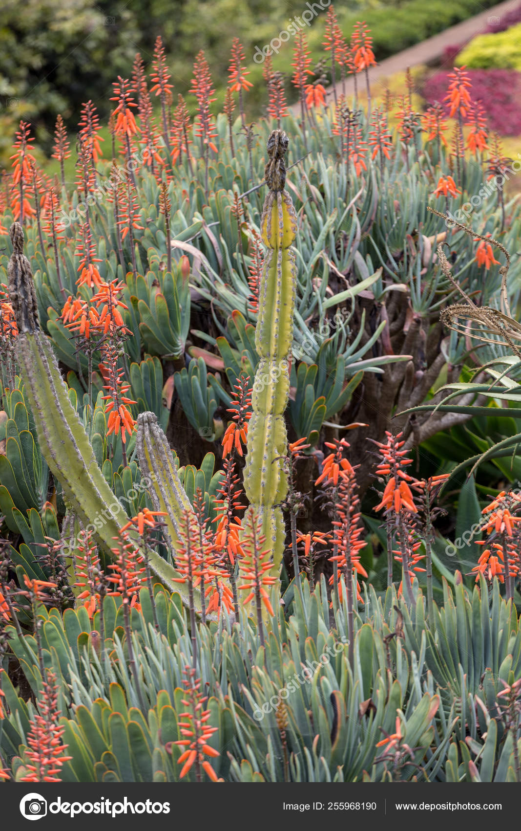 Tall Succulent Aloe Plant With Bright Orange Flowers Stock Photo