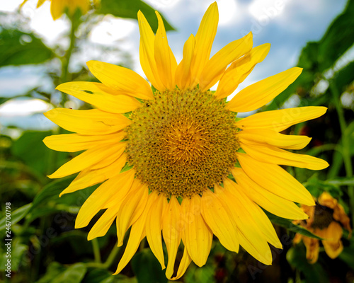 Lindo Girassol Amarelo No Campo Contra O Ceu Azul Com Nuvens
