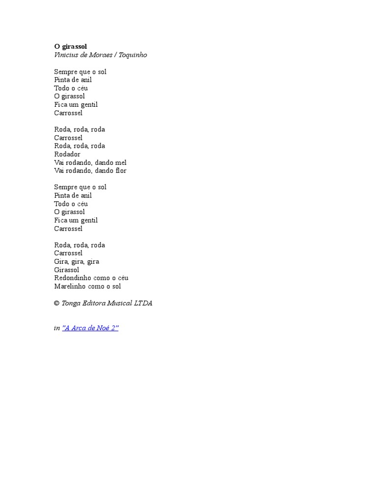 O girassol vinicius de moraes. Escola francisca simoes 30843 views. Vinicius de moraes sempre que o sol pinta de anil todo o ceu o girassol fica um gentil carrossel. 05 na cancao ha alguns versos iniciados com travessao.