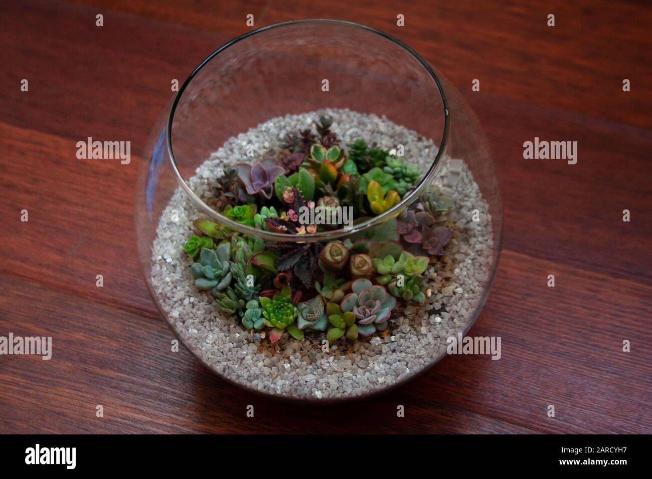 Colorful Succulents Fairy Garden In Glass Sphere Terrarium On